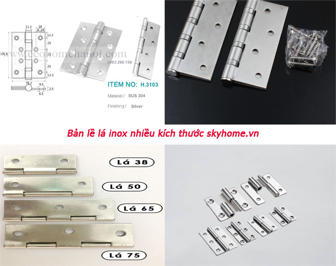 Bản lề lá inox nhiều kích thước là một loại bản lề cửa dùng để liên kết giữa bản lề cửa với thân cửa. Bản lề cửa thiết kế bởi inox, có nhiều kích thước khác nhau nhằm thích hợp với từng loại cửa khác nhau. Bản lề lá inox có nhiều loại gồm: