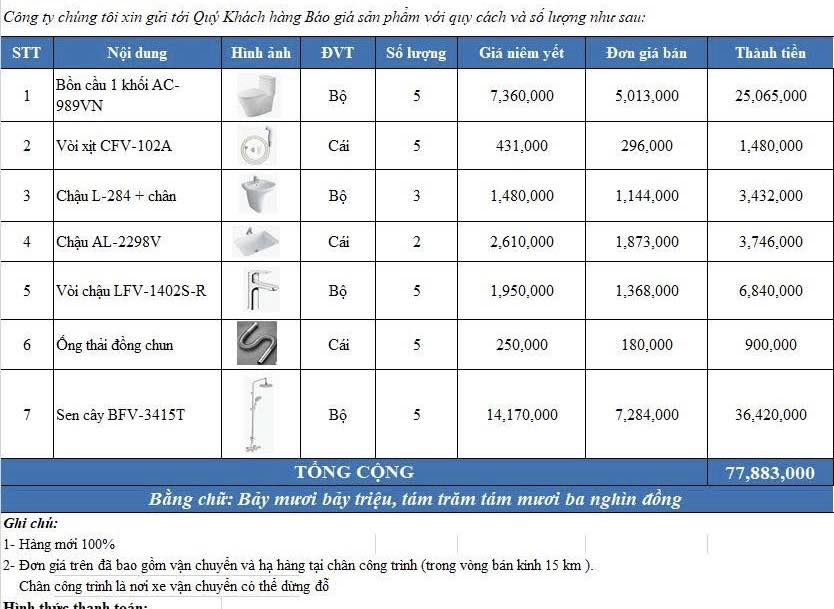 Tổng giá trị báo giá thiết bị vệ sinh là 77.883.000 đồng, được tính dựa trên số lượng thực tế từng loại sản phẩm nhân với đơn giá bán đã chiết khấu, thấp hơn so với giá niêm yết của nhà sản xuất. Báo giá bao gồm các thiết bị chính cho khu vệ sinh như bồn cầu một khối, chậu rửa, vòi chậu, sen cây và phụ kiện đi kèm, đảm bảo đồng bộ và đầy đủ cho công trình. Toàn bộ sản phẩm đều là hàng mới 100%, đúng chủng loại, mẫu mã như đã nêu. Đơn giá bán trong bảng đã bao gồm chi phí vận chuyển và hạ hàng tại chân công trình trong bán kính 15 km, với điều kiện công trình có vị trí thuận lợi cho xe vận chuyển dừng đỗ. Việc tách riêng giá niêm yết và giá bán giúp khách hàng dễ dàng đối chiếu mức chiết khấu, đồng thời minh bạch tổng chi phí đầu tư thiết bị vệ sinh cho công trình.