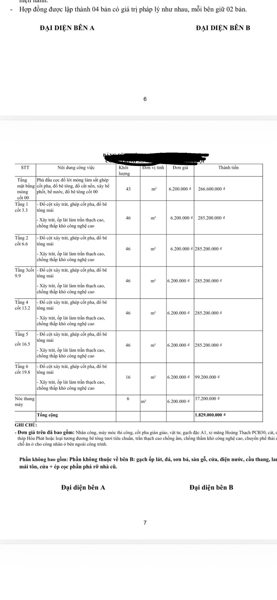 Tổng giá trị xây dựng phần thô của công trình là 1.829.000.000 đồng, được tính theo đơn giá khoán 6.200.000 đồng/m² sàn, áp dụng thống nhất cho toàn bộ các tầng từ móng đến tầng 6 và khu vực nóc thang máy. Khối lượng sàn được xác định cụ thể cho từng tầng, trong đó các tầng điển hình (tầng 1 đến tầng 5) có diện tích 46 m², riêng tầng móng là 43 m², tầng 6 là 16 m² và phần nóc thang máy là 6 m². Đơn giá này đã bao gồm chi phí nhân công, máy móc thi công, cốp pha, giàn giáo, vật tư cơ bản như gạch xây, xi măng PCB30, cát, đá, thép (Hòa Phát hoặc tương đương), bê tông tươi tiêu chuẩn, trần thạch cao chống ẩm, chống thấm khu vệ sinh, cũng như chi phí vận chuyển vật liệu và chỗ ở công nhân. Các hạng mục không bao gồm trong giá là phần hoàn thiện như gạch ốp lát, đá, sơn bả, cửa, điện nước hoàn thiện, cầu thang, mái tôn và các công tác phá dỡ nhà cũ (nếu có). Việc bóc tách rõ ràng khối lượng và đơn giá giúp chủ đầu tư dễ kiểm soát chi phí và thuận lợi trong quá trình nghiệm thu từng giai đoạn.
