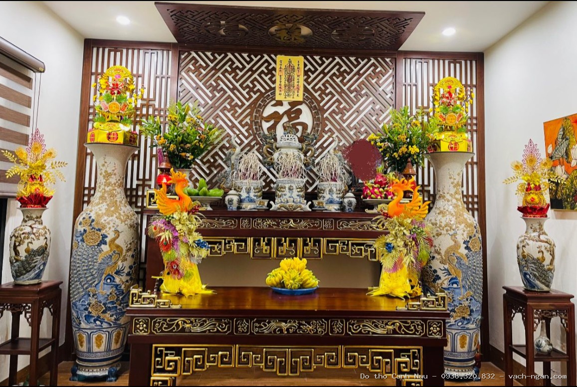 Công trình bàn thờ gỗ cao cấp được Nghệ nhân Sơn Vũ trực tiếp lắp đặt. Chúng tôi cam kết không làm vách ngăn, chỉ chuyên tâm vào đồ thờ tâm linh chất lượng cao.