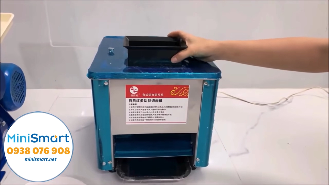 Khi vận hành, chỉ cần đặt thịt vào khay, máy sẽ tự động kéo xuống và cắt lát mỏng.