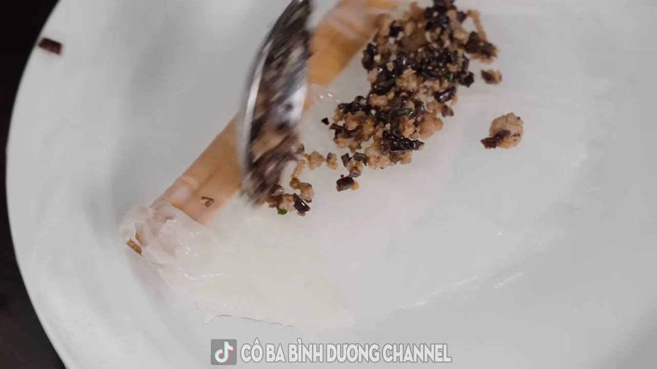 Xào nhân bằng dầu, hành tím, đầu hành và thịt băm nhuyễn, dùng đũa dằm tơi thịt, thêm nấm mèo, nêm gia vị: 2 muỗng cà phê hạt nêm, 1 muỗng cà phê đường, 1/4 muỗng cà phê bột ngọt, tiêu, sau đó cho hành lá và 1–2 muỗng canh hành phi trộn đều rồi tắt bếp.
