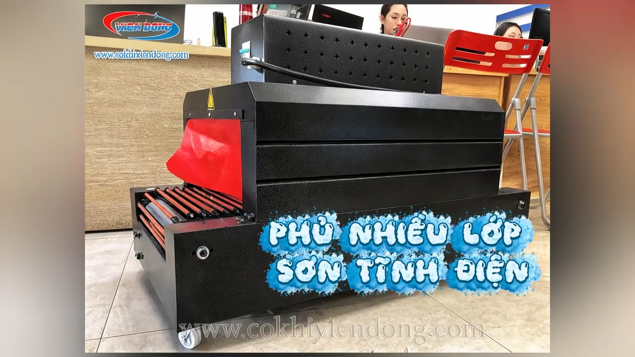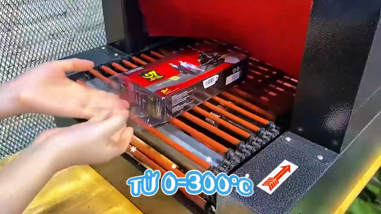 Buồng làm việc của máy được thiết kế khá rộng với kích thước khoảng 80 cm chiều dài, 40 cm chiều ngang và 20 cm chiều cao. Bên trong buồng là hệ thống băng tải cùng các bóng đèn hồng ngoại được bố trí xung quanh. Khi máy hoạt động, nhiệt lượng tỏa ra sẽ làm màng co ôm sát vào bề mặt sản phẩm, giúp sản phẩm được bọc kín và chắc chắn hơn.