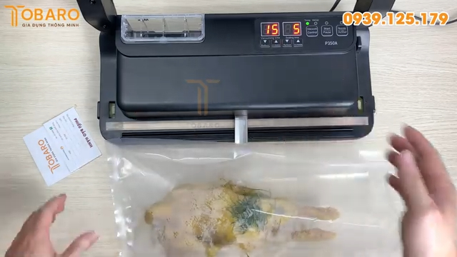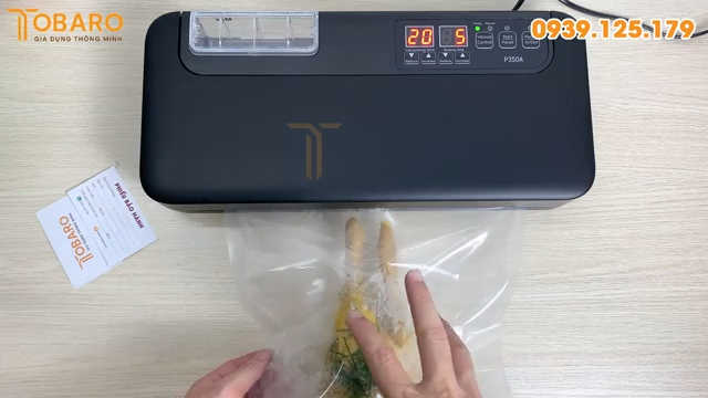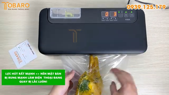 Sau khi đặt túi đúng vị trí, nhấn nút Start để bắt đầu quá trình hút chân không. Máy P350A có lực hút mạnh, giúp hút hết không khí, đồng thời có thể hút cả phần nước hoặc dầu mỡ bên trong túi. Quá trình hút diễn ra nhanh chóng và hiệu quả, giúp túi ôm chặt vào sản phẩm.