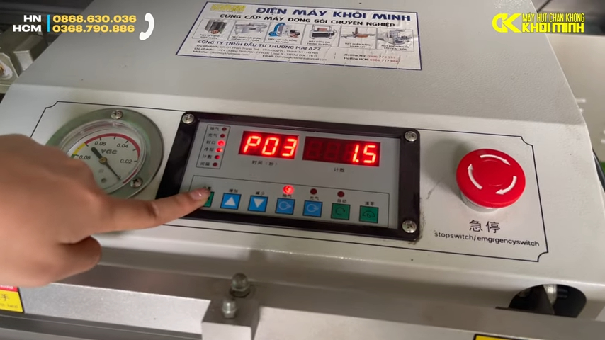 Trên bảng điều khiển cũng có nút dừng khẩn cấp, khi có sự cố trong quá trình hút chân không anh chị có thể bấm dừng ngay lập tức để đảm bảo an toàn.