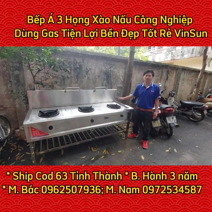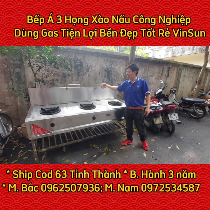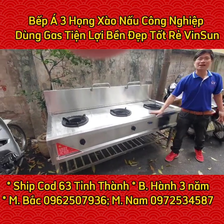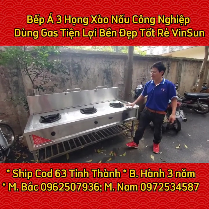 Bếp Á 3 họng xào nấu công nghiệp dùng gas là thiết bị bếp chuyên dụng được sử dụng rất phổ biến trong các nhà hàng, quán ăn, bếp ăn tập thể và khu bếp công nghiệp nhờ khả năng nấu nhanh, lửa mạnh và phù hợp cho việc chế biến nhiều món ăn cùng lúc; sản phẩm có thiết kế chắc chắn, bền đẹp và đáp ứng tốt nhu cầu nấu nướng liên tục trong môi trường bếp kinh doanh.