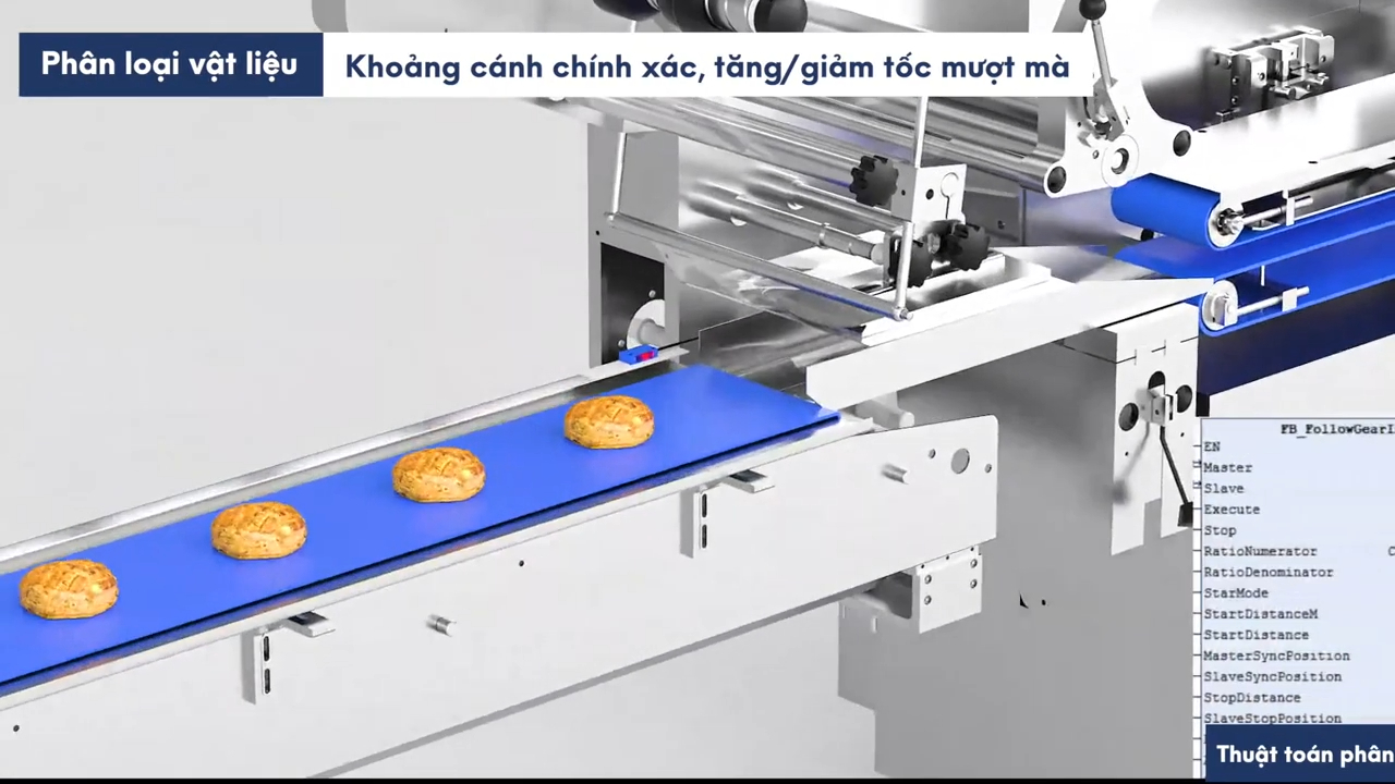 Kết hợp với thuật toán cấp liệu thông minh dòng FAL, hệ thống sử dụng phương pháp điều khiển con lăn điện tử, giúp kiểm soát chuyển động truyền động một cách chính xác và nâng cao mức độ tự động hóa. Thuật toán cấp liệu này giúp tối ưu hóa tốc độ và vị trí sản phẩm theo quỹ đạo vận hành, từ đó nâng cao độ chính xác và sự ổn định của quá trình đóng gói. Khoảng cách giữa các gói sản phẩm có thể đạt độ sai lệch chỉ khoảng 1mm.