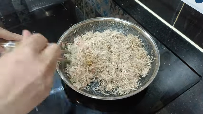 Sau khi máy đánh xong cần kiểm tra lại xem phần nào còn dính gân hoặc mỡ thì tách ra để sợi chà bông được tơi hơn. Tiếp theo cho chà bông vào chảo và bật lửa vừa để đảo đều. Trong quá trình đảo có thể thêm một ít nước mắm ngon để tăng hương vị cho chà bông.