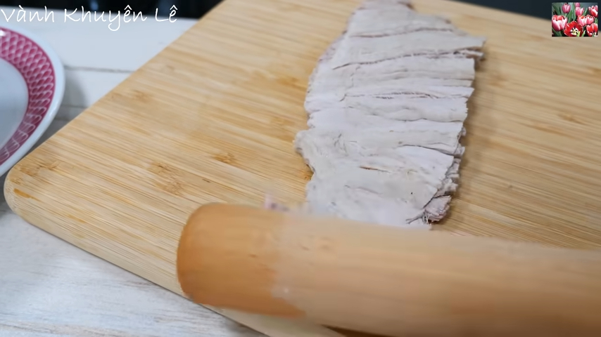 Một lưu ý quan trọng là phải để thịt nguội hoàn toàn rồi mới tiến hành đập và xé. Nếu xé thịt khi còn nóng thì rất dễ bị bỏng tay và sợi thịt cũng không tơi. Khi thịt nguội, dùng chày đập nhẹ vào giữa miếng thịt để làm mềm và làm tách sợi. Nên đập vào phần giữa thân chày để lực đều, tránh dùng đầu nhọn của chày vì dễ làm thịt bị nát. Sau khi đập xong, sợi thịt sẽ tách ra và chỉ cần gỡ nhẹ bằng tay là thịt sẽ tơi ra rất nhanh.