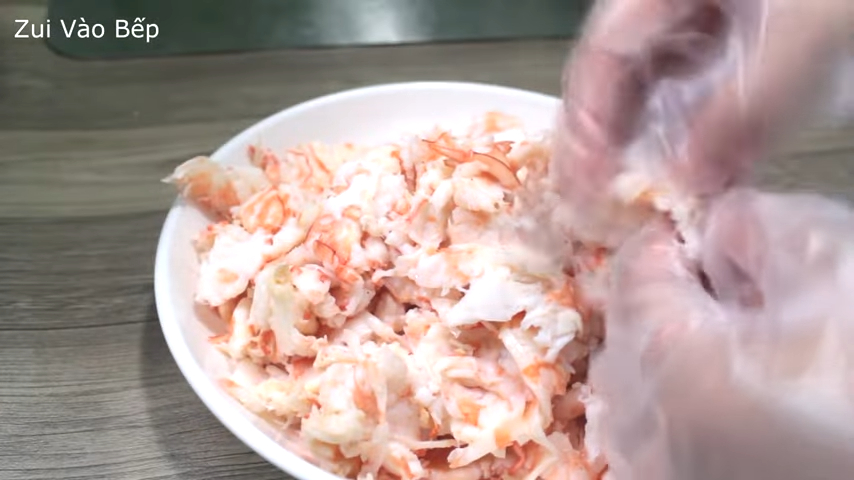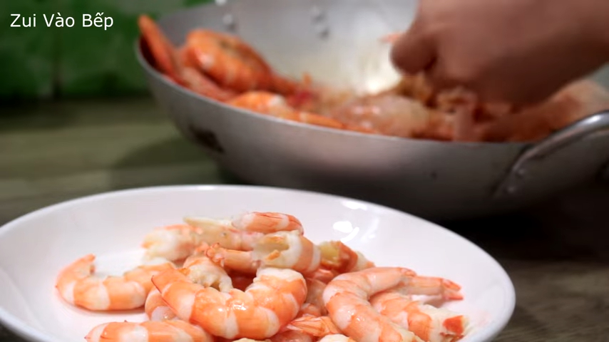 Khi tôm đã nguội, tiến hành bỏ đầu và lột vỏ tôm. Vì tôm đã được nấu chín nên vỏ sẽ rất dễ bóc. Sau khi bóc vỏ, dùng dao rạch nhẹ một đường trên lưng tôm để loại bỏ phần chỉ đen. Bước này giúp tôm sạch hơn và khi làm chà bông sẽ ngon hơn. Sau đó cho phần thịt tôm vào túi nilon hoặc cho vào cối rồi dùng chày đập nhẹ để làm tôm mềm và tơi ra. Việc đập sơ sẽ giúp tôm dễ xé và dễ chế biến hơn.