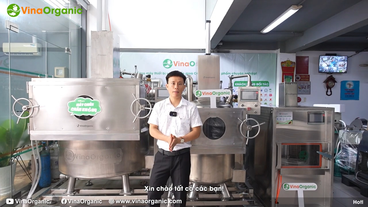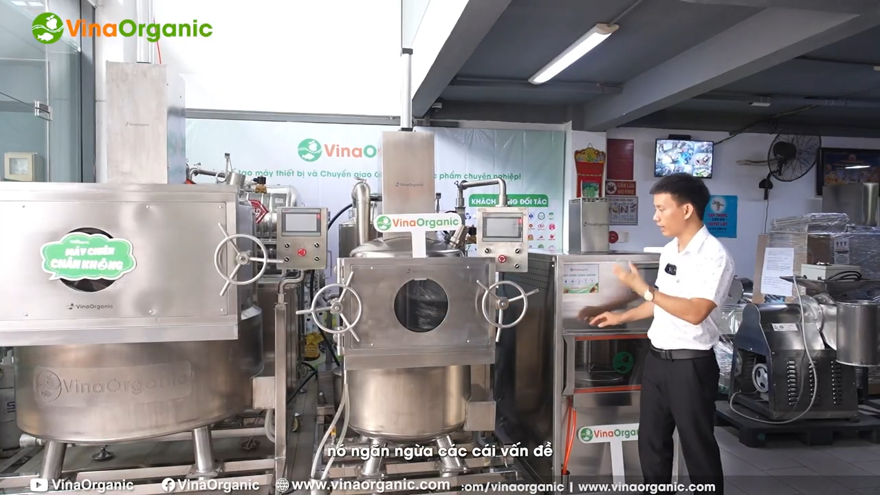 Tuy nhiên đối với các dòng máy chiên chân không công nghiệp có công suất lớn từ khoảng 10kg trở lên như 10kg, 20kg, 30kg, 50kg, 100kg hoặc 200kg mỗi mẻ thì thiết kế sẽ có sự khác biệt rõ ràng. Các dòng máy công nghiệp thường không thiết kế dạng hộp kín hoàn toàn mà để lộ nhiều bộ phận cấu tạo của máy. Lý do là trong sản xuất công nghiệp cần quan sát trực tiếp các hệ thống như hệ thống bơm chân không, hệ thống gia nhiệt, hệ thống lọc dầu, hệ thống nước làm mát và nhiều bộ phận khác để thuận tiện cho việc vận hành, kiểm tra và bảo trì. Khi các bộ phận được bố trí lộ ra ngoài và sắp xếp khoa học, người vận hành có thể dễ dàng kiểm soát trạng thái hoạt động của thiết bị, từ đó nâng cao hiệu quả sản xuất cũng như kéo dài tuổi thọ của máy.