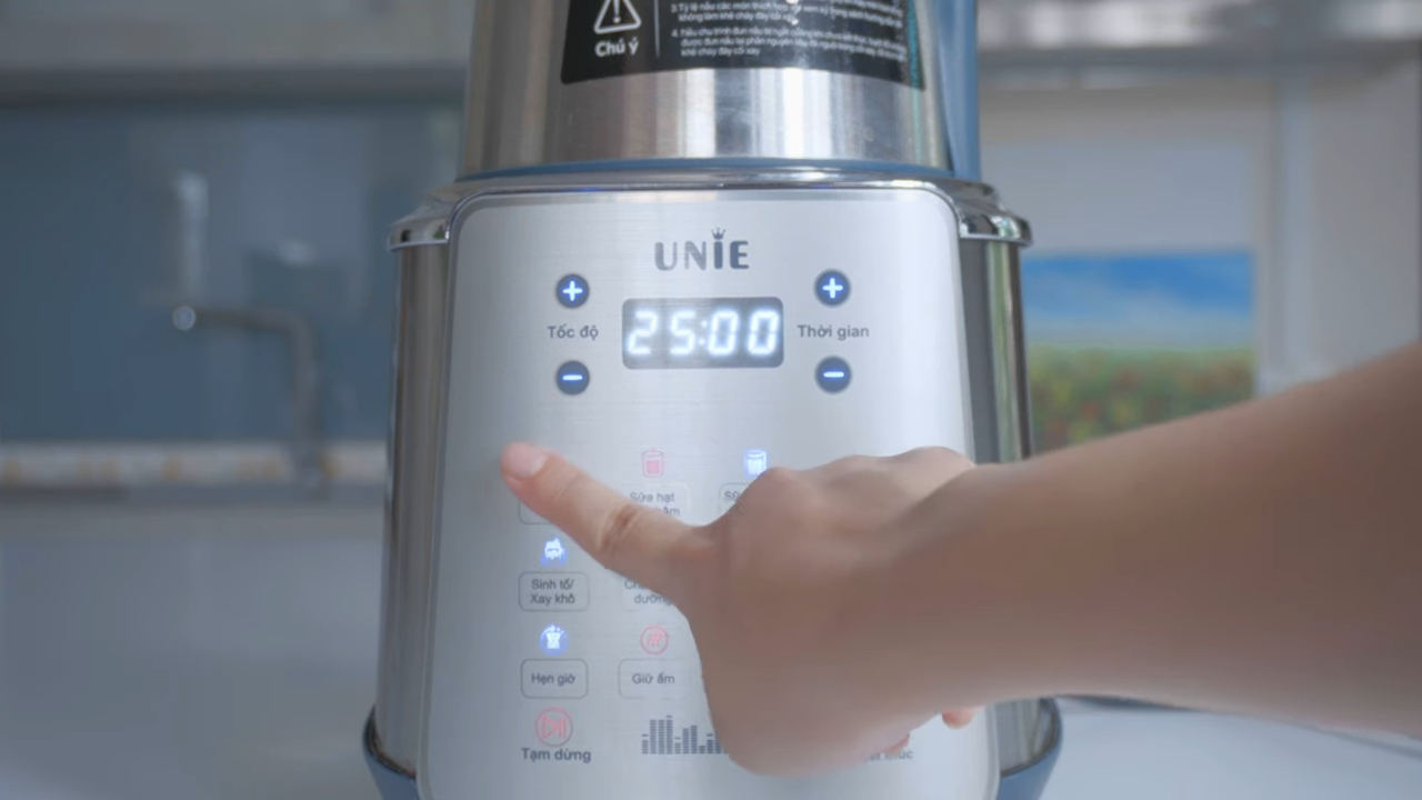 Tiếp theo cho đậu nành đã ngâm vào máy làm sữa hạt và thêm lượng nước phù hợp theo dung tích của máy, sau đó chọn chế độ nấu sữa đậu nành trên bảng điều khiển của máy để thiết bị tự động thực hiện các bước xay, nấu và hoàn thành quá trình chế biến sữa.