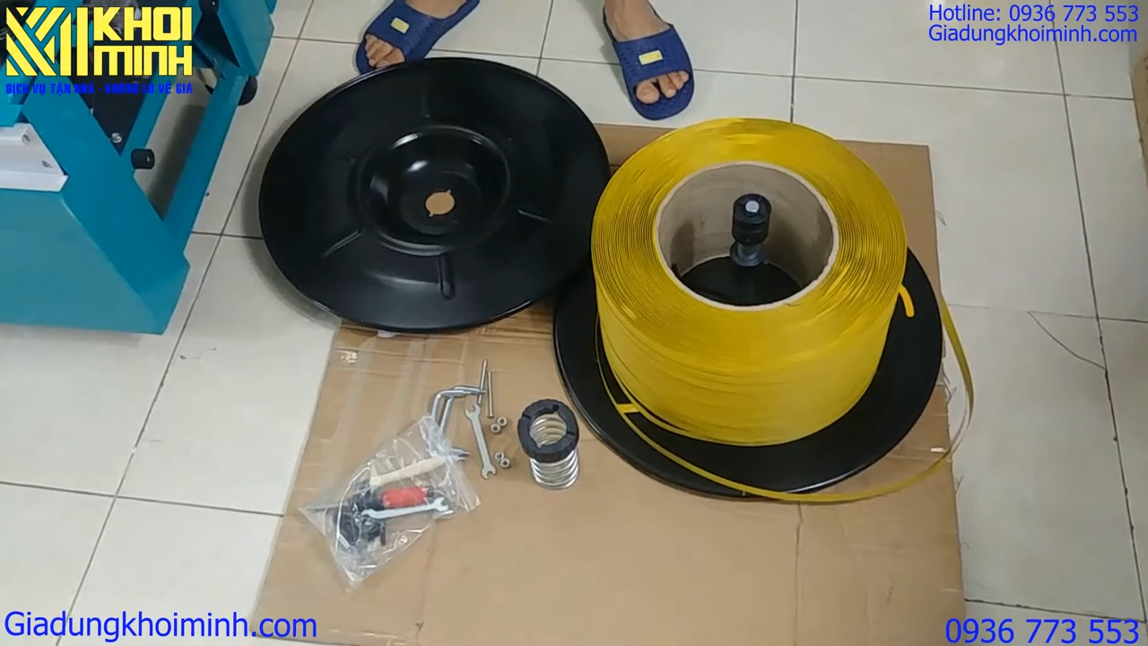 Giới thiệu đến các bạn chiếc máy đóng dây đai nhựa dạng bán tự động bàn thấp 900N do Khôi Vy phân phối. Dòng máy này có hai loại là loại bàn cao và loại bàn thấp. Trong video hôm nay mình sẽ giới thiệu loại bàn thấp, với phần chứa cuộn dây đai được đặt ở bên ngoài máy. Đồng thời mình cũng sẽ hướng dẫn cho các bạn cách lắp đặt và sử dụng chiếc máy này một cách chi tiết. Đầu tiên, để lắp đặt và sử dụng máy, chúng ta sẽ bắt đầu với bộ phận chứa cuộn dây đai nhựa. Nếu các bạn để ý trên nắp của bộ phận này sẽ có ký hiệu mũi tên để hướng dẫn chiều lắp dây cho đúng. Khi lắp cuộn dây, các bạn cần chú ý lắp đúng chiều theo mũi tên để máy có thể hoạt động ổn định.