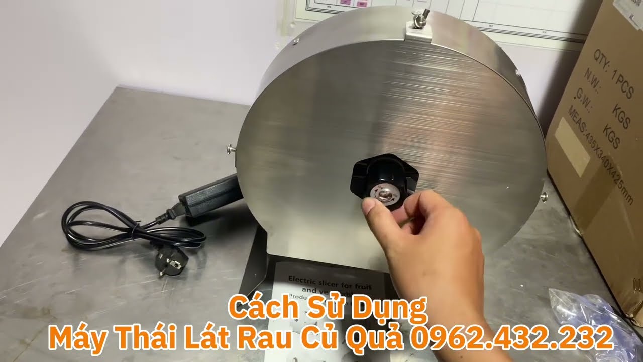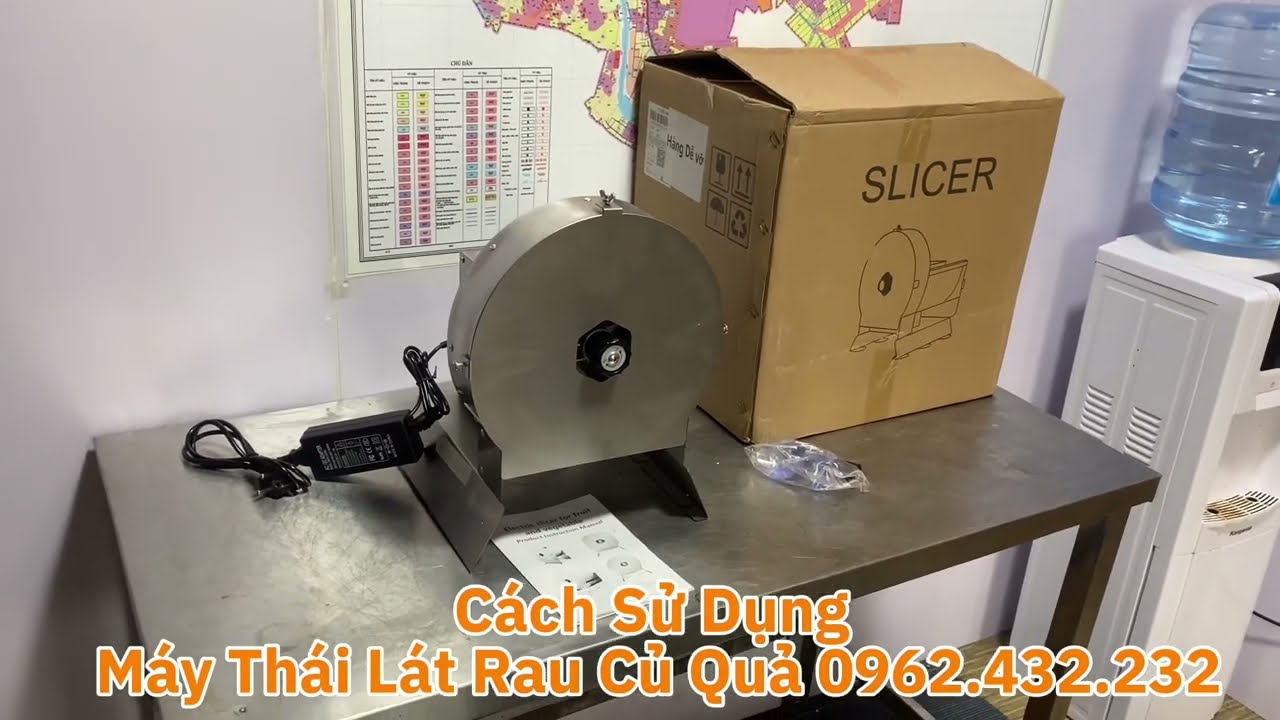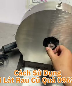 Bước thứ hai là chuẩn bị nguyên liệu rau củ cần thái. Sau đó anh chị cắm nguồn điện 220V cho máy và đặt máy lên một chiếc chậu lớn hoặc khay lớn để khi thái rau củ, thành phẩm sẽ rơi trực tiếp xuống khay mà không cần phải nhặt lại.