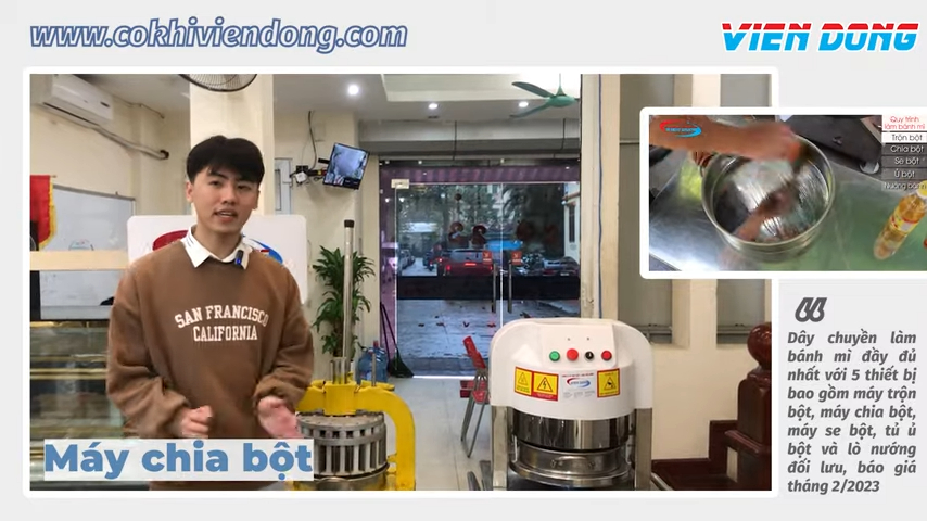 Thiết bị thứ hai trong dây chuyền là máy chia bột. Máy này giúp chia khối bột thành các phần nhỏ đều nhau để tạo hình bánh mì dễ dàng và nhanh chóng. Hiện có hai loại phổ biến là máy chia bột dùng tay và máy chia bột dùng điện. Cả hai loại đều có khả năng chia bột thành khoảng 36 phần bằng nhau với khối lượng mỗi phần từ khoảng 30g đến 180g. Máy chia bột dùng tay có giá khoảng 10.900.000 đồng, còn máy chia bột dùng điện có giá khoảng 18.500.000 đồng.
