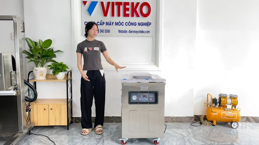 Buồng hút của máy có kích thước khoảng 53 x 58 cm, tạo không gian rộng rãi để đặt nhiều túi sản phẩm, nâng cao hiệu quả đóng gói và tiết kiệm thời gian trong quá trình sản xuất. Máy được trang bị bơm hút chân không công suất khoảng 900W và tổng công suất máy khoảng 1600W, giúp hút từ 120 đến 140 túi mỗi giờ với lực hút mạnh và ổn định.