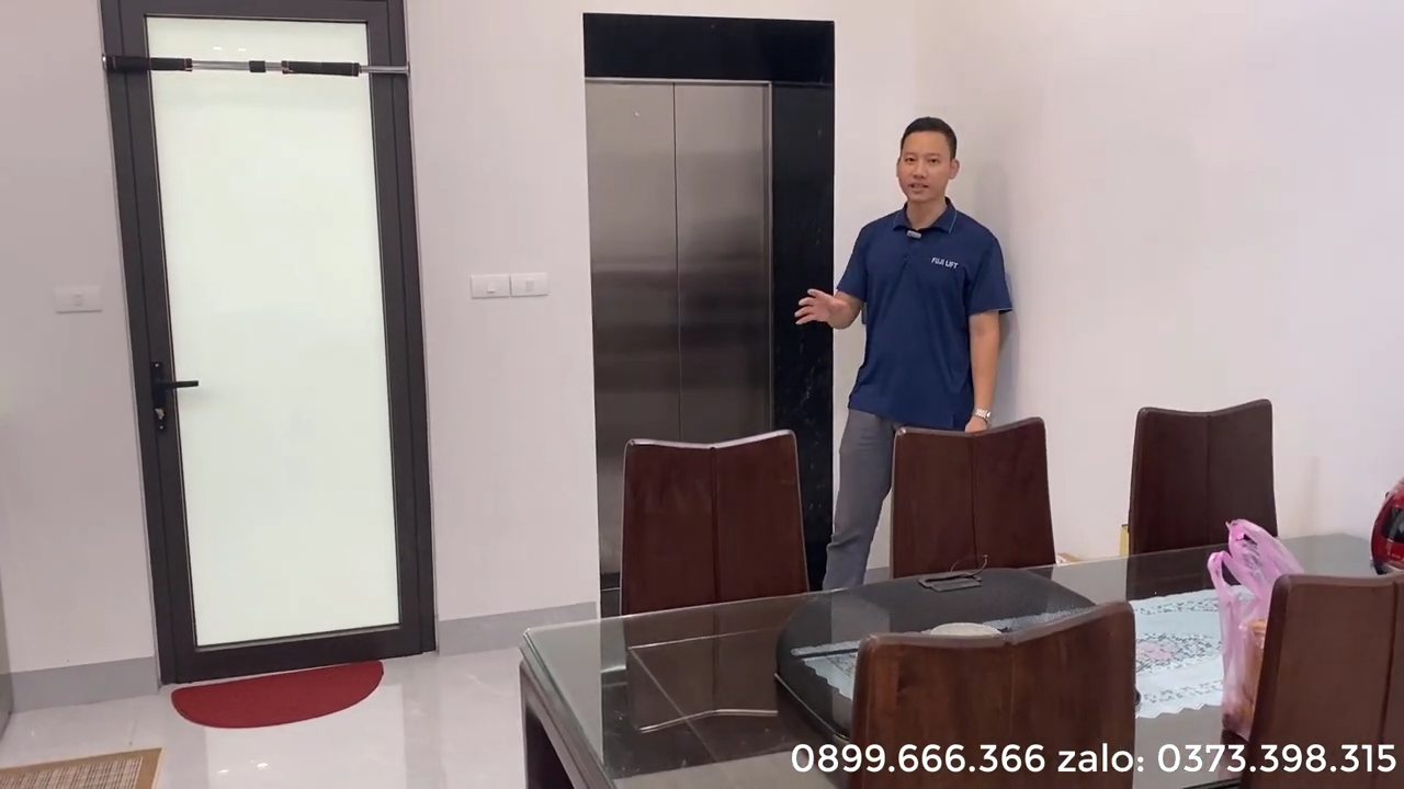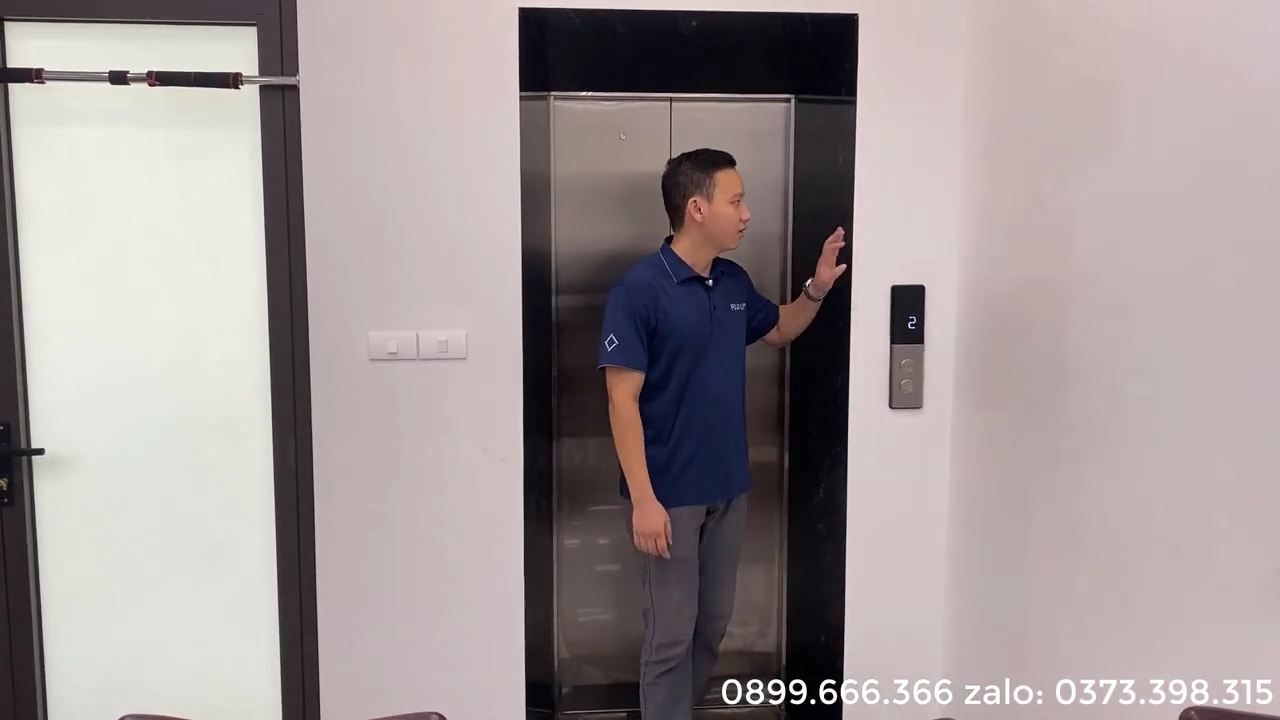 Từ không gian này, đội ngũ kỹ thuật đã tối ưu để bố trí cabin thang máy có kích thước rộng 950mm và sâu 750mm. Với cấu hình này, thang máy có thể phục vụ 3–4 người di chuyển thoải mái trong cùng một lần vận hành. Cửa thang được thiết kế rộng 700mm, giúp việc di chuyển các thiết bị gia đình như máy giặt, tủ lạnh hoặc đồ nội thất trở nên thuận tiện hơn. Khu vực sảnh chờ được xử lý thẩm mỹ bằng phương án ốp đá chéo vào lòng cửa, tạo cảm giác không gian rộng và sang trọng hơn dù diện tích thực tế của sảnh khá hạn chế.