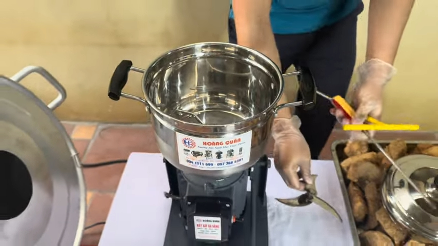 Sau khi xé tơi thịt xong, toàn bộ phần thịt sẽ được chuyển sang công đoạn rang ruốc bằng máy rang đảo 10kg. Máy rang ruốc sử dụng nồi nhôm kết hợp khung chân sắt chắc chắn cùng motor đảo tự động giúp đảo ruốc liên tục trong quá trình rang.
