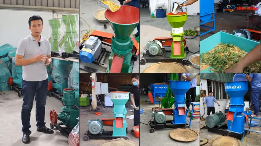 Giới thiệu đến quý vị các dòng sản phẩm máy ép cám viên do công ty Bình Minh sản xuất, đồng thời giải đáp một câu hỏi mà rất nhiều bà con chăn nuôi quan tâm: nên sử dụng cám viên công nghiệp hay tự sản xuất cám viên thì tốt hơn. Mời quý vị cùng theo dõi nội dung chi tiết ngay sau đây. Trước hết, chúng tôi xin trả lời câu hỏi về các dòng máy ép cám viên trục đứng hiện nay của công ty Bình Minh. Tại xưởng sản xuất của chúng tôi đang có đầy đủ các dòng máy phổ biến trên thị trường. Các dòng máy ép cám viên trục đứng của Bình Minh hiện nay bao gồm các model như S150, S200, S250, S270, S300, S350, S400 và S450. Trong đó S150 và S200 là những dòng máy được sử dụng rất phổ biến cho các hộ chăn nuôi vừa và nhỏ. Những dòng lớn hơn như S300, S350, S400 hay S450 thường được sử dụng cho các trang trại quy mô lớn hoặc các cơ sở sản xuất cám.