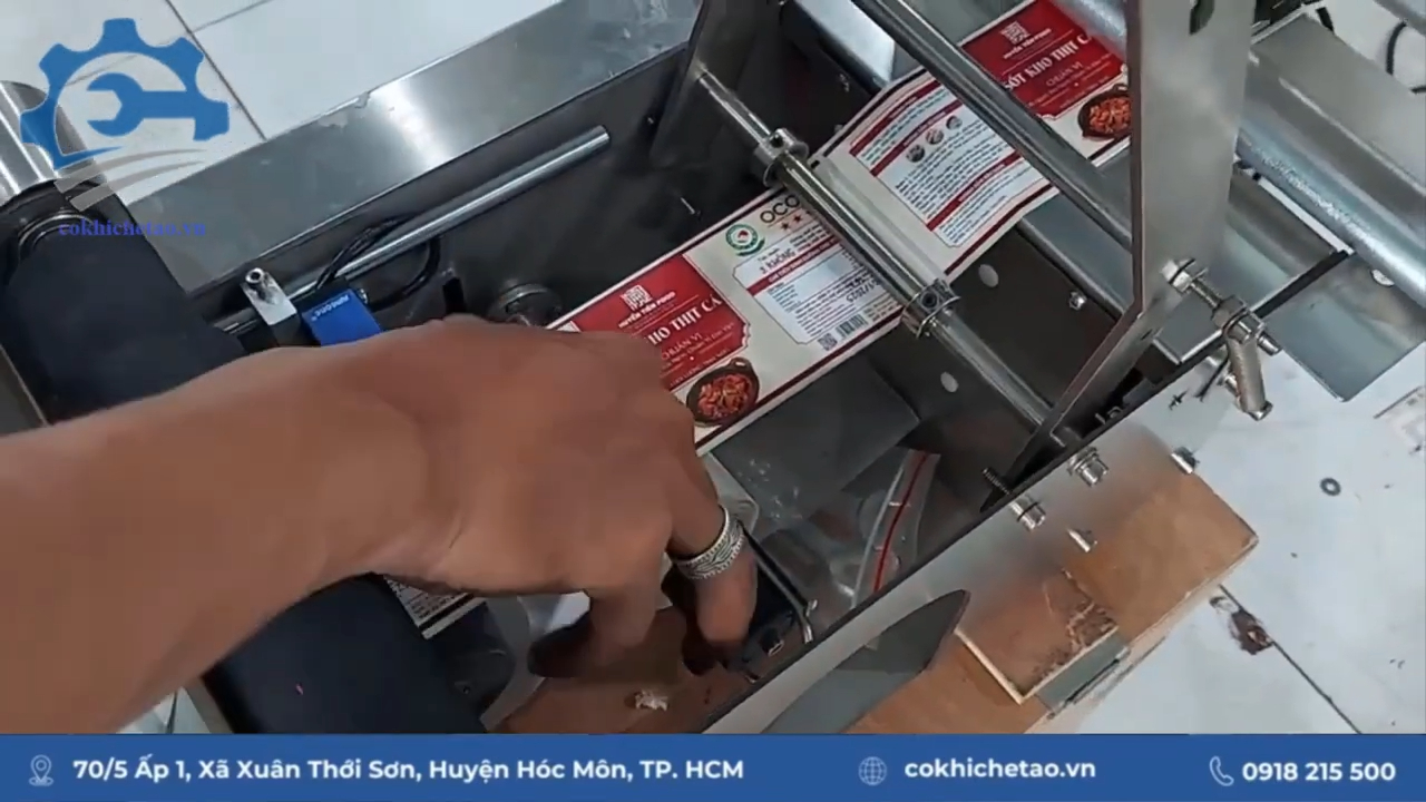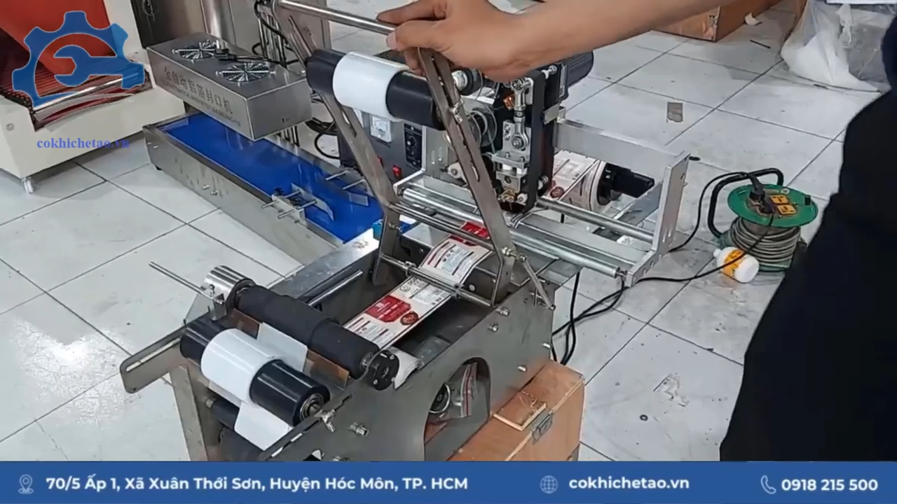 Đối với tem nhãn, máy có thể sử dụng nhãn với chiều dài tối đa khoảng 230 mm và chiều rộng tối đa khoảng 150 mm. Máy cũng được trang bị một cảm biến đọc nhãn để xác định vị trí tách nhãn. Khi máy hoạt động, nhãn sẽ được tách ra từng cái một, mỗi lần vận hành máy sẽ cấp đúng một nhãn cho một sản phẩm. Ở phía bên này máy còn có một cảm biến khác kết nối với bộ in date. Mỗi lần gạt cần vận hành, cảm biến sẽ kích hoạt bộ in date in thông tin lên nhãn, sau đó tiếp tục dán nhãn lên sản phẩm.