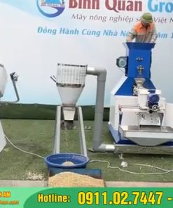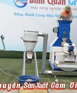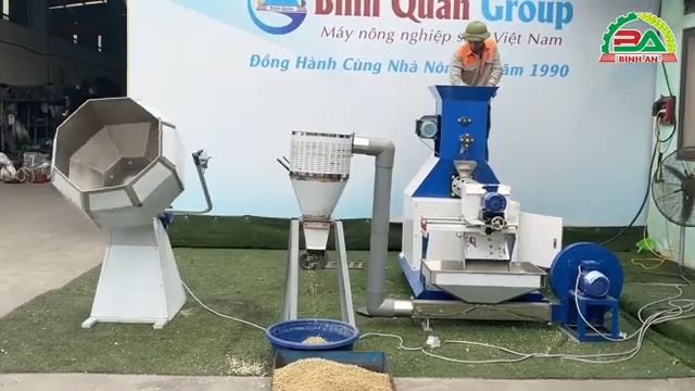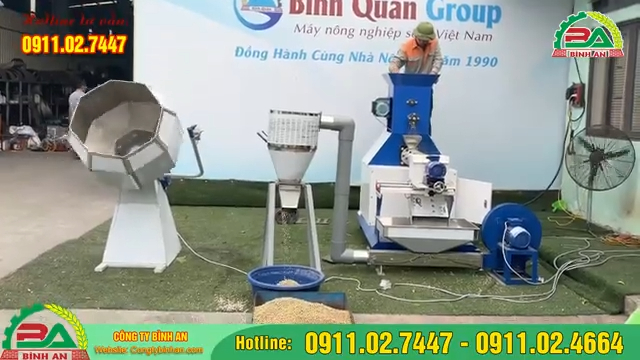 Công ty Bình An xin kính chào quý vị khách hàng. Hôm nay, Thu Ngân xin giới thiệu đến quý vị bộ dây chuyền sản xuất cám viên nổi, giúp bà con chăn nuôi sản xuất số lượng lớn cám viên nổi phục vụ cho các loại thủy hải sản như cá, tôm, ếch, hoặc các loài vật nuôi khác như gà, lợn, ngan. Bộ dây chuyền này bao gồm ba sản phẩm chính: Máy đùn viên thức ăn chăn nuôi 150k, Bộ thổi nguội hạt, và Máy trộn tẩm gia vị. Đây là combo ba dòng sản phẩm rất được ưa chuộng hiện nay trong ngành sản xuất cám viên. Để bắt đầu quá trình sản xuất cám viên nổi, quý vị chỉ cần chuẩn bị nguyên liệu, sau đó sử dụng máy đùn viên thức ăn chăn nuôi 150k để ép cám viên. Sau khi cám viên được ép ra, chúng sẽ rơi xuống bộ thổi hạt, nơi hệ thống quạt gió sẽ làm nguội và tơi các viên cám. Cuối cùng, cám sẽ được chuyển vào máy trộn tẩm gia vị để trộn đều với dầu thực vật hoặc các gia vị dinh dưỡng, giúp viên cám trở nên ngon miệng và bổ dưỡng hơn cho vật nuôi.