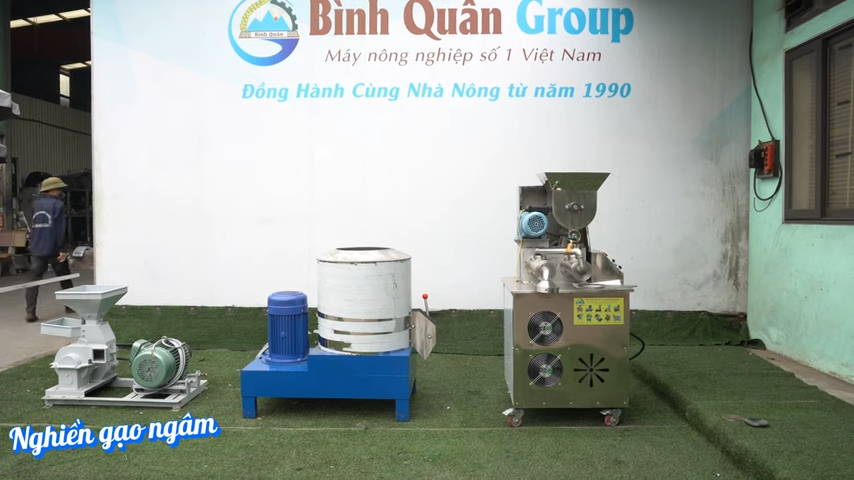 Thiết bị đầu tiên là máy nghiền gạo B122, đây là máy dùng để nghiền gạo thành bột gạo ẩm – nguyên liệu chính để sản xuất mì khô. Do các dòng máy đùn mì chỉ có chức năng tạo sợi mì từ bột nên nguyên liệu cần phải được nghiền trước khi đưa vào máy đùn. Máy nghiền B122 có khả năng nghiền nguyên liệu với năng suất cao, mỗi giờ có thể nghiền khoảng 500 kg gạo ẩm. Máy được trang bị động cơ công suất từ 5,5 kW đến 7,5 kW sử dụng điện 3 pha 380V, giúp máy hoạt động mạnh mẽ và ổn định trong thời gian dài. Thiết kế của máy khá gọn gàng nên dễ dàng lắp đặt tại các cơ sở sản xuất hoặc xưởng chế biến thực phẩm. Hiện nay mức giá tham khảo cho dòng máy nghiền gạo B122 sử dụng động cơ 7,5 kW khoảng 13,7 triệu đồng.