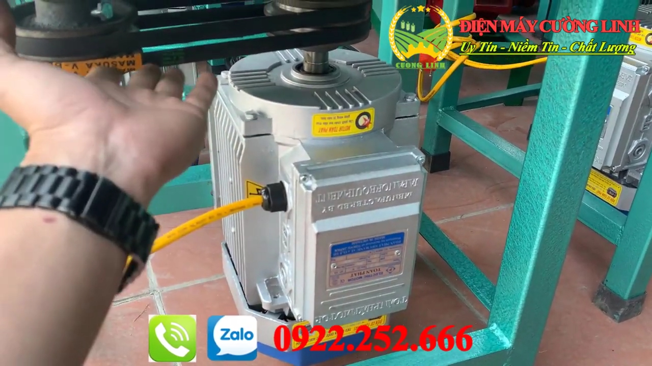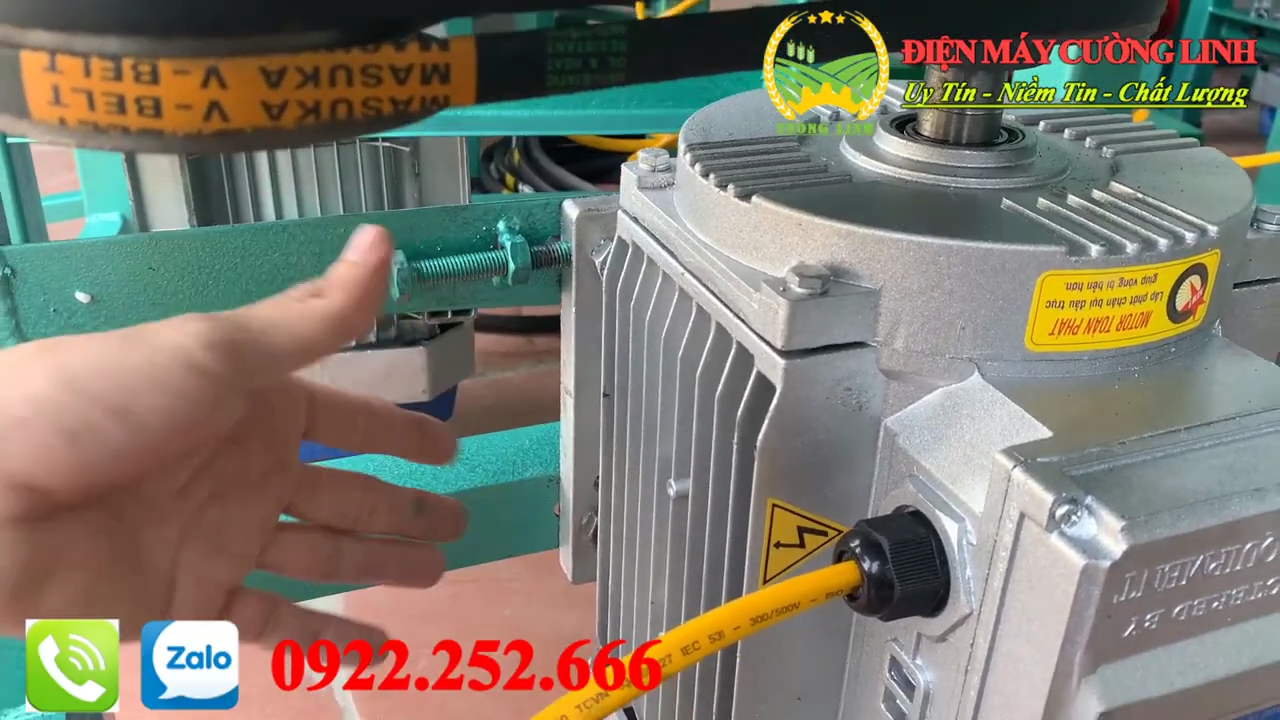 Tiếp theo là phần động cơ. Hiện tại máy đang được lắp động cơ Toàn Phát công suất 2,2 kW. Tốc độ quay của động cơ khoảng 2.900 vòng mỗi phút nên lực băm và nghiền rất mạnh. Động cơ được bảo hành 12 tháng, nếu trong thời gian bảo hành có lỗi kỹ thuật thì sẽ được hỗ trợ đổi mới. Hệ truyền động của máy sử dụng dây curoa và hai puly có kích thước khác nhau để truyền lực từ động cơ sang trục dao. Nhờ vậy tốc độ quay của lưỡi dao rất nhanh, giúp nghiền ngô hoặc băm nguyên liệu hiệu quả. Trong quá trình sử dụng, nếu dây curoa bị trùng thì bà con chỉ cần điều chỉnh lại vị trí động cơ bằng con ốc tăng chỉnh phía dưới là có thể siết lại dây rất dễ dàng.
