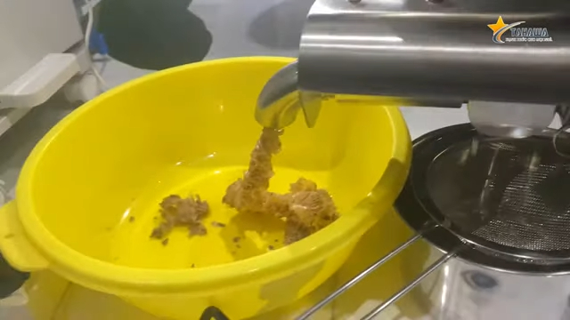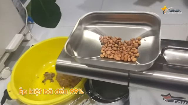 Trong quá trình ép, chú quan sát rất kỹ từng dòng dầu chảy ra từ máy. Kết quả sau khi ép cho thấy một bên là dầu nguyên chất, còn một bên là bã đậu phộng khô kiệt, chứng tỏ máy ép hoạt động hiệu quả. Phần bã sau khi ép khô gần như kiệt dầu, khả năng ép đạt khoảng 99%, gần như không còn dầu sót lại trong bã. Đây chính là ưu điểm nổi bật giúp máy ép dầu Tahawa TH-888A được nhiều gia đình tin tưởng lựa chọn.