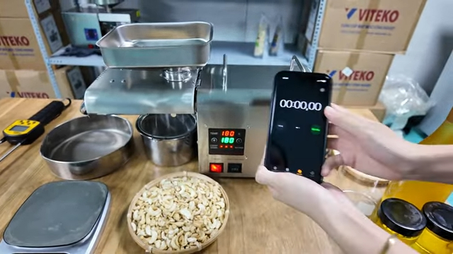 Với máy ép dầu gia đình, việc tự làm dầu điều nguyên chất trở nên vô cùng đơn giản. Chỉ cần chuẩn bị hạt điều đã bóc vỏ, sấy sơ để đạt độ ẩm phù hợp, sau đó cài đặt nhiệt độ khoảng 180°C và cho nguyên liệu vào máy. Khi máy bắt đầu hoạt động, những giọt dầu vàng óng sẽ từ từ chảy ra với mùi thơm đặc trưng của hạt điều, rất hấp dẫn.