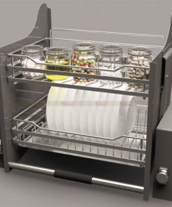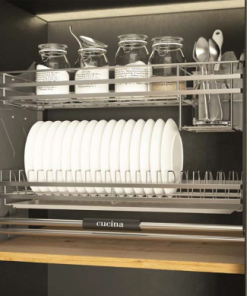 - Giá bát đĩa nâng hạ: Đây là loại giá bát đĩa được thiết kế với hệ thống ray trượt giúp nâng lên hạ xuống dễ dàng. Giá bát đĩa nâng hạ giúp tiết kiệm diện tích tủ bếp và thuận tiện cho việc lấy bát đĩa.
