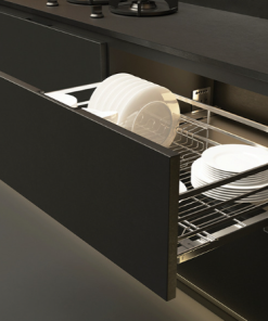 Giá để bát đĩa Grob được thiết kế phù hợp với khoang tủ bếp dưới, gắn cánh tủ để tạo nét thẩm mỹ cho không gian bếp. Kệ dao thớt để bàn được làm từ chất liệu inox 304 cao cấp, độ bền cao, không gỉ và chịu lực tốt. Có hai bộ ray trượt được gắn vào hai bên hộc tủ, giảm chấn tích hợp giúp cho việc mở và đóng giá trơn tru, không gây tiếng.