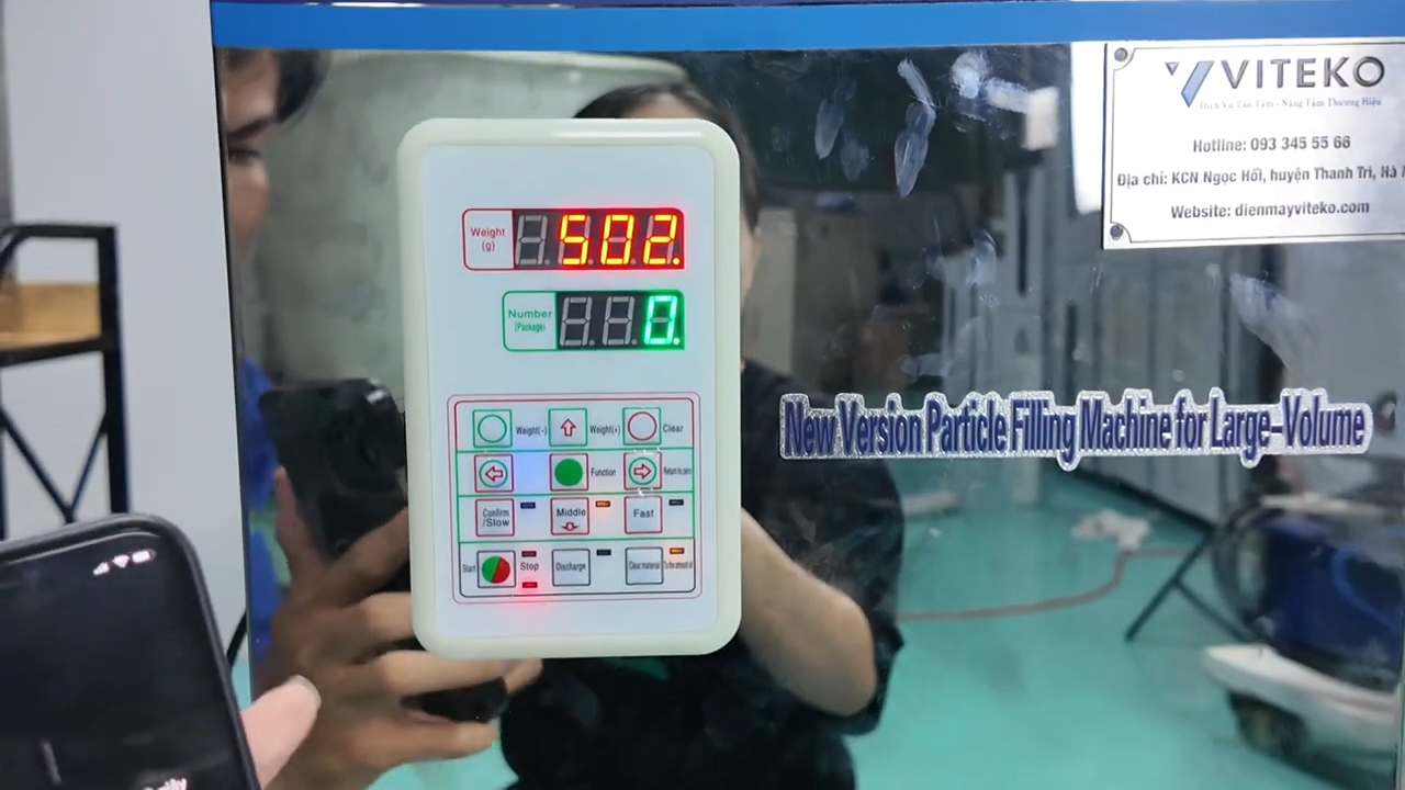 Khi bắt đầu vận hành, chúng tôi nhấn nút khởi động và bắt đầu bấm giờ. Trong quá trình hoạt động, sau khi xả nguyên liệu ra một túi thì máy sẽ tiếp tục cân và chuẩn bị cho túi tiếp theo, toàn bộ quá trình diễn ra liên tục và rất dễ thao tác. Sau khi hết một phút, kết quả cho thấy máy có thể đóng gói được 5 túi sản phẩm. Các túi sản phẩm này đều có trọng lượng khoảng 500 gram nên rất đồng đều và giúp sản phẩm trở nên chuyên nghiệp hơn khi đóng gói.