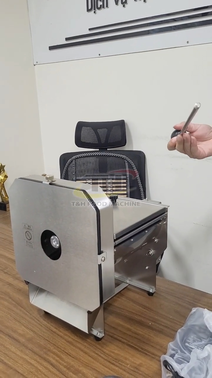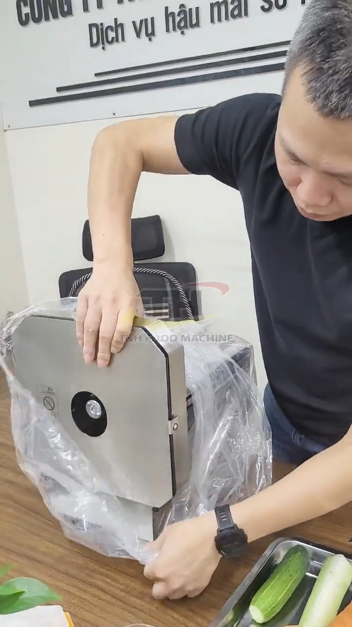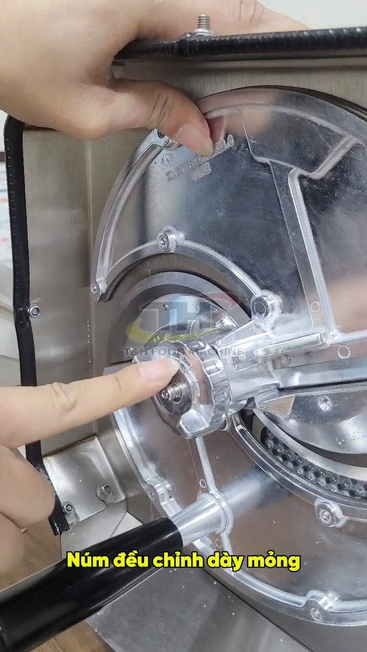 Sau khi lắp xong, mọi người có thể thử quay để kiểm tra. Máy vẫn hoạt động bình thường và tốc độ thái sẽ phụ thuộc vào tốc độ quay tay của người sử dụng. Sau khi kiểm tra xong, chúng ta tháo tay quay ra và lắp lại thanh chắn như ban đầu.