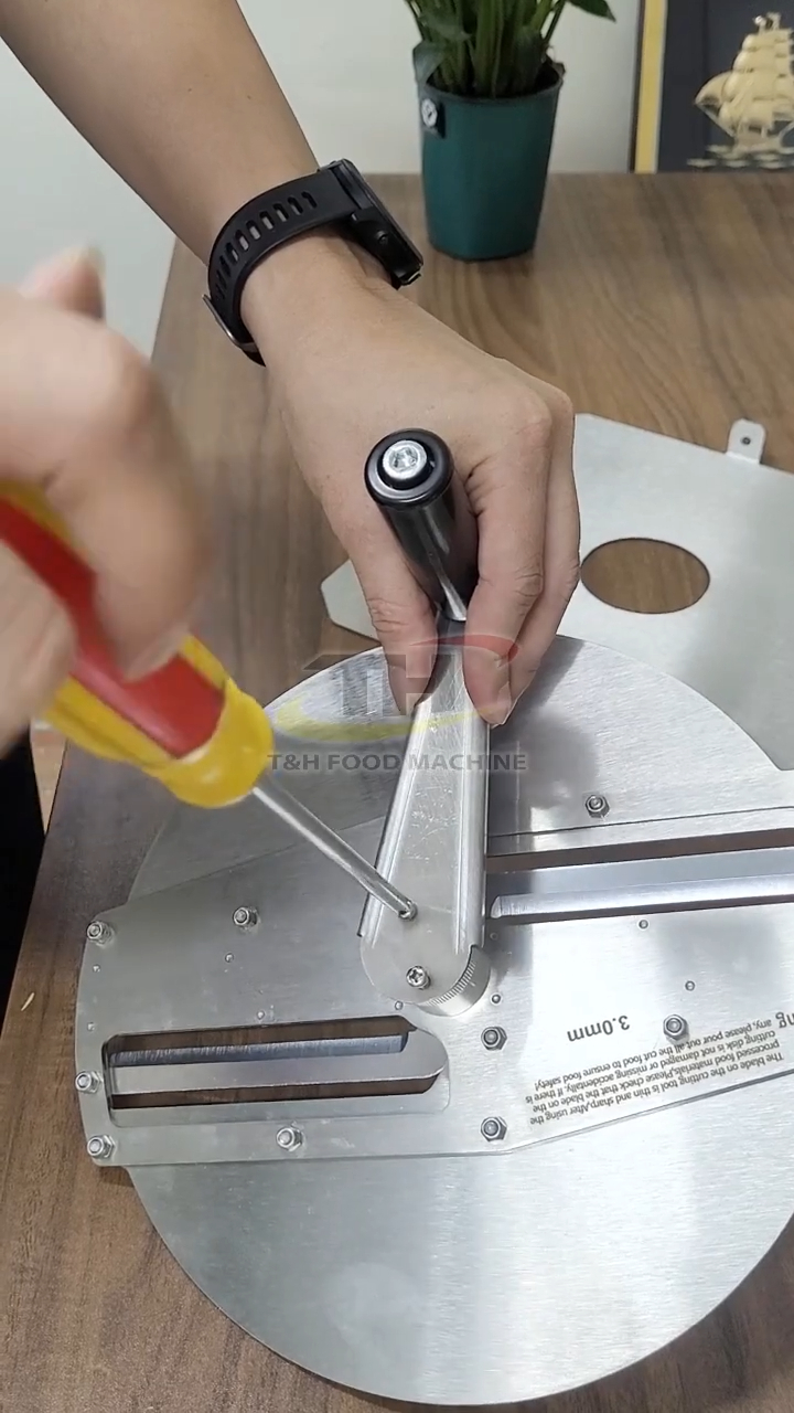 Sau khi lắp xong, chúng ta có thể kéo thanh ép nguyên liệu ra để kiểm tra. Thanh ép này dùng để ép rau củ khi thái, giúp nguyên liệu không bị trượt ra ngoài. Thiết kế này khá thông minh và rất tiện khi sử dụng.