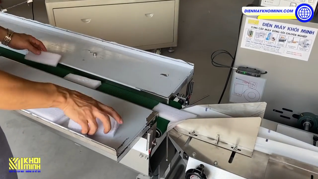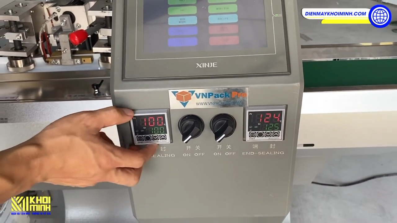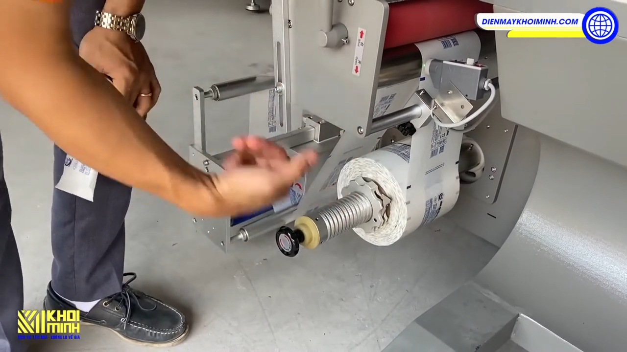 Bước đầu tiên khi sử dụng máy là lắp đặt cuộn màng. Tất cả các máy đóng gói nằm ngang tại Khôi Minh đều có sơ đồ lắp cuộn màng được dán trực tiếp trên thân máy, vì vậy các bạn có thể dễ dàng làm theo sơ đồ hướng dẫn. Trong video này tôi đã lắp sẵn cuộn màng vì quá trình lắp đặt sẽ mất khá nhiều thời gian.