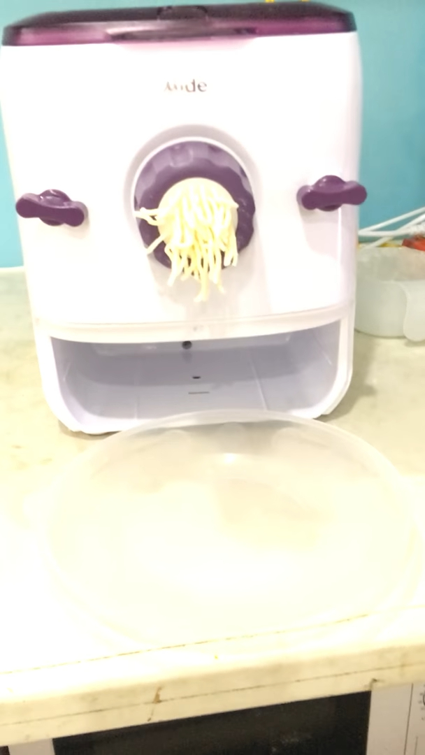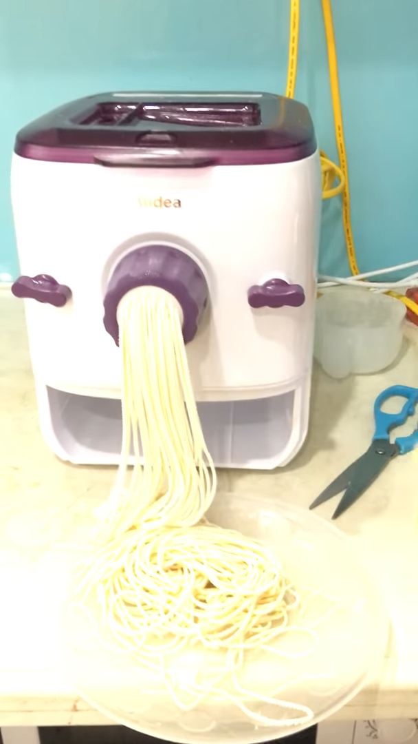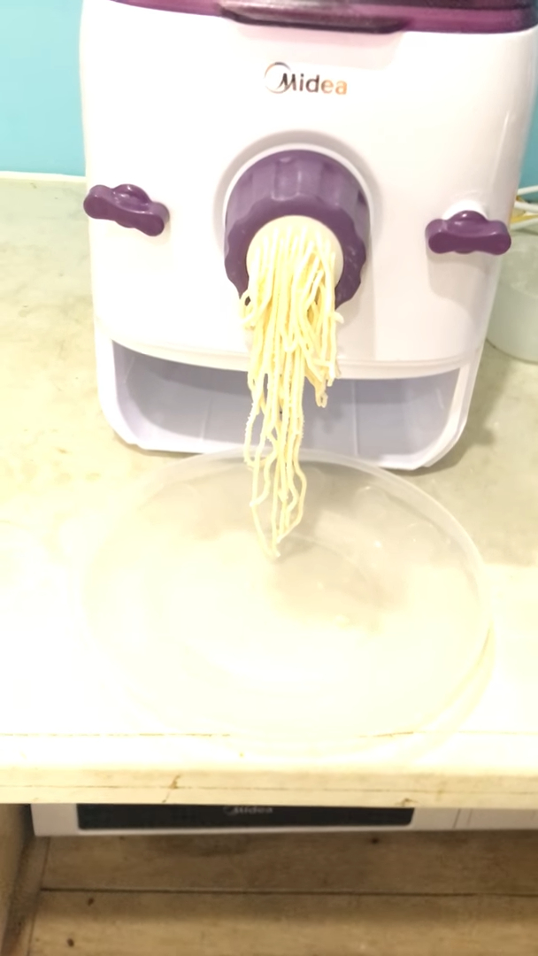 Sau khi trộn xong, máy sẽ tự động chuyển sang bước đùn mì. Lúc này bột sẽ được ép qua khuôn để tạo thành các sợi mì tươi. Người dùng chỉ cần quan sát và dùng kéo cắt sợi mì khi đạt chiều dài mong muốn, thường khoảng 10 đến 15cm rồi cuộn lại thành từng vắt mì.