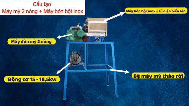 Tiếp theo, bột gạo ẩm sẽ được đưa vào máy đùn mì 2 nòng. Hệ thống máy thường gồm một phễu nạp bột bằng inox, một hệ thống đùn và tủ điều khiển điện. Máy sử dụng động cơ điện ba pha công suất lớn, thường từ khoảng 15 đến 18,5 kW để đảm bảo lực đùn mạnh và ổn định. Trong quá trình vận hành, bột gạo sẽ được đưa vào nòng đùn thứ nhất để gia nhiệt và làm chín sơ bộ. Khi nhiệt độ trong máy đạt mức cần thiết, người vận hành sẽ mở van xả nhiệt để bột tiếp tục đi qua nòng đùn thứ hai. Tại đây bột sẽ được ép qua mặt sàng có nhiều lỗ nhỏ để tạo thành các sợi mì hoặc sợi bún. Kích thước sợi mì phụ thuộc vào loại mặt sàng được lắp trên máy. Ví dụ, mặt sàng có lỗ khoảng 8 mm là loại khá phổ biến để sản xuất sợi mì hoặc bún khô. Khi bột được ép qua khuôn, các sợi mì sẽ đi ra đều và dài.