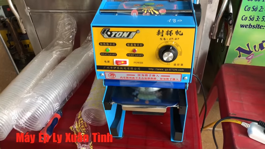 Máy sử dụng nguồn điện 220V. Sau khi cắm điện, bật công tắc khởi động và cài đặt nhiệt độ ép khoảng 170°C. Máy này là máy ép thủ công nên có cần gạt để dập nắp. Mỗi lần ép xong chúng ta sẽ quay khay một lần để đưa ly tiếp theo vào vị trí ép.