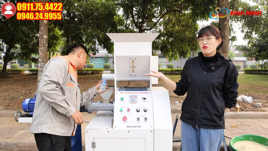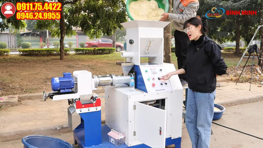 Sau khi đấu nối điện, bà con cần cài đặt nhiệt độ cho máy. Đối với cám viên nổi, bà con nên đặt nhiệt độ từ 130°C trở lên, trong khi làm cám viên chìm và thường thì nhiệt độ sẽ thấp hơn. Sau khi cài đặt xong, bật công tắc nhiệt để máy tự chạy và đợi khoảng 15 phút để nhiệt độ đạt yêu cầu.