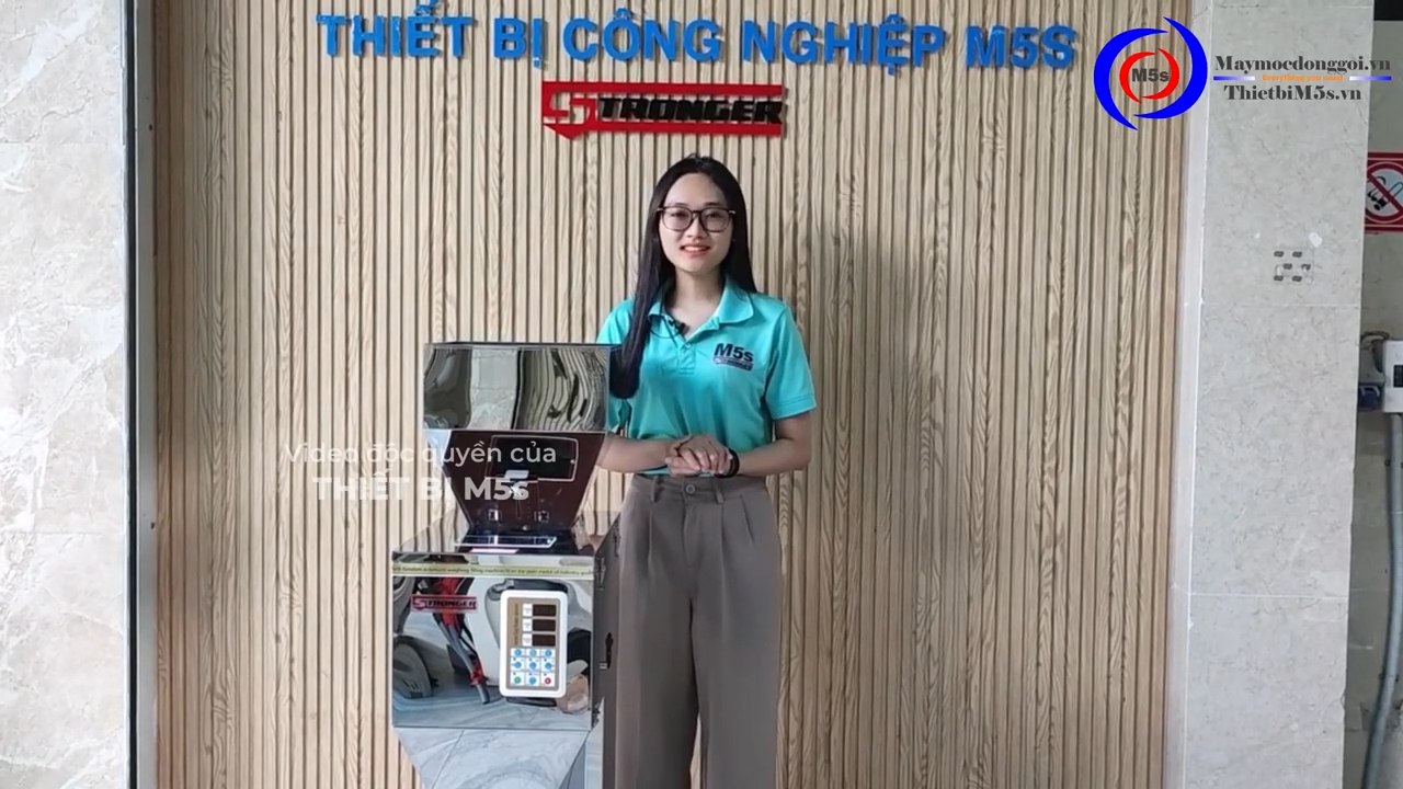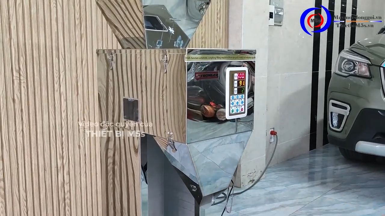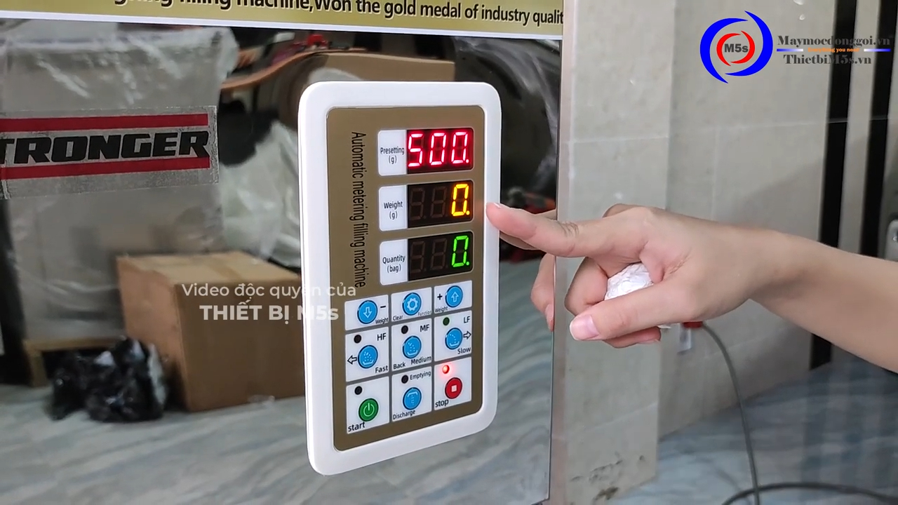 Máy bắt đầu hoạt động và chúng ta có thể thấy đồng hồ hiển thị đúng 500 gram, không bị dư cũng không bị thiếu. Mình thử cân liên tiếp 3 lần, kết quả vẫn rất chính xác và ổn định. Sau khi máy hoàn thành việc cân định lượng, chúng ta sẽ kiểm tra lại bằng cân điện tử bên ngoài để đảm bảo độ chính xác. Kết quả kiểm tra cho thấy khối lượng đúng 500 gram, gần như không có sai số.