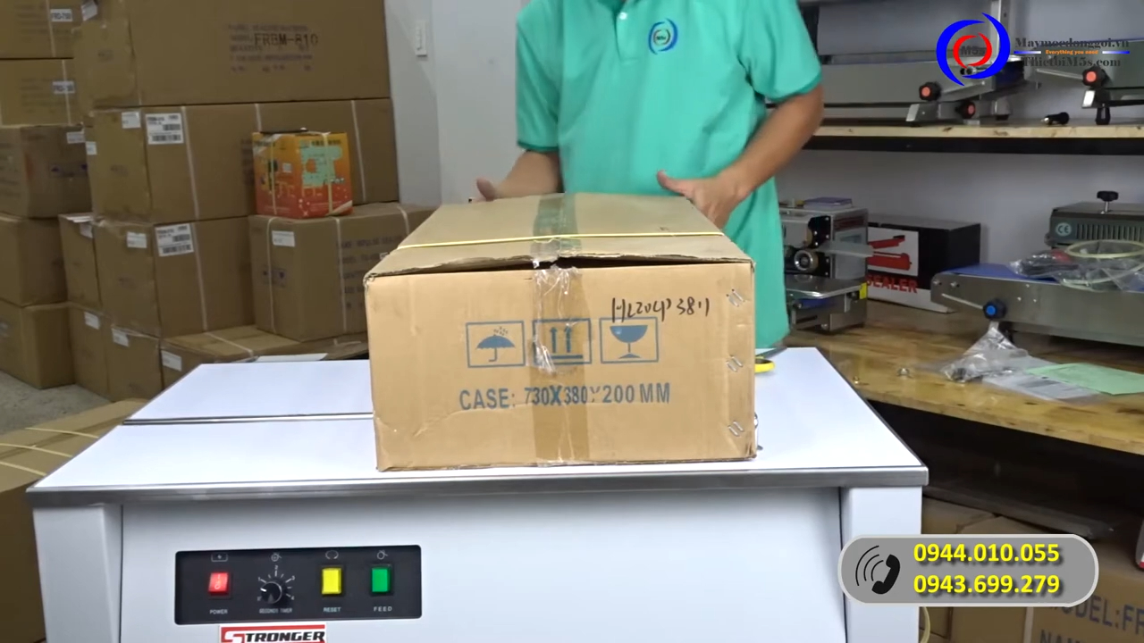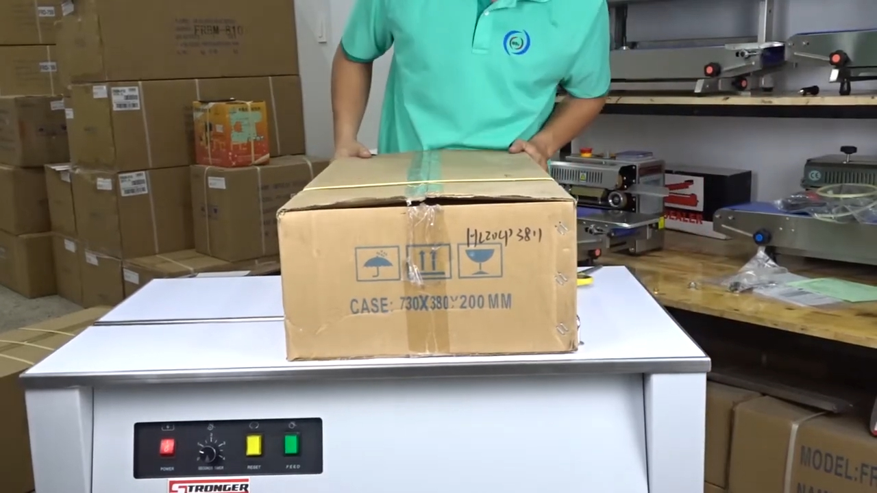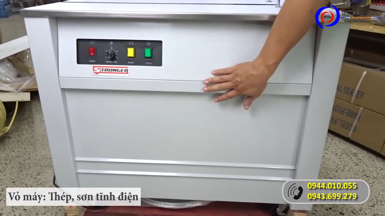 Vận hành máy đóng đai thùng carton Stronger – nút điều khiển và điều chỉnh lực siết