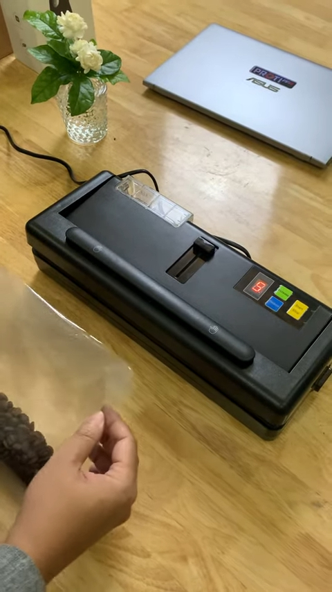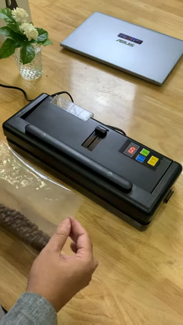 Trong quá trình hàn miệng túi, máy sẽ hiển thị thời gian đếm ngược. Khi đồng hồ hiển thị từ 5, 4 và tiếp tục giảm dần về 0 thì quá trình hàn túi đang diễn ra. Sau khi thời gian kết thúc, bạn nhấc tay ra và lấy túi ra khỏi máy. Lúc này túi đã được hút chân không và hàn kín hoàn toàn, đảm bảo thực phẩm được bảo quản tốt hơn và kéo dài thời gian sử dụng.