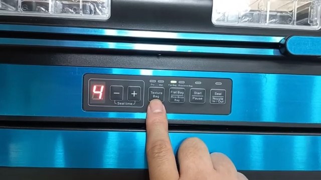 Ở phần bảng điều khiển bên cạnh có tổng cộng 4 nút chức năng chính và toàn bộ đều được ghi bằng tiếng Anh nên người dùng cần chú ý. Nút đầu tiên là Texture Bag, đây là chế độ hút dành cho các loại túi định hình như túi chè, túi nhám hoặc các loại túi có hạt nổi thường dùng để đóng gói bánh kẹo trong siêu thị. Ở trên màn hình còn có hai chế độ Dry và Wet, trong đó Dry là chế độ hút đồ khô còn Wet là chế độ hút đồ ướt hoặc thực phẩm có nước. Nút thứ hai là Fracture Bag, chế độ này dùng cho túi hai mặt trơn hoặc túi nhám. Trên bảng điều khiển sẽ hiển thị Fracture Bag cho túi trơn và Brick Bag cho túi nhám. Khi sử dụng loại túi nào thì chúng ta phải chọn đúng chức năng tương ứng để máy hoạt động hiệu quả nhất. Bên cạnh đó còn có nút Start để khởi động máy và nút Stop để dừng khi cần. Ngoài ra còn có nút Seal là chế độ hàn miệng túi và nút In/Out để bật hoặc tắt vòi hút ra vào. Tất cả các chức năng này giúp máy có thể hút được hầu hết các loại túi hiện nay nên khi sử dụng cần chọn đúng chế độ tương ứng với loại túi.