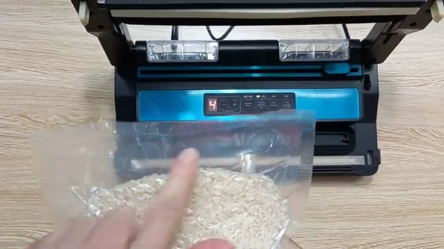 Bây giờ chúng ta sẽ thử thực tế để mọi người thấy rõ khả năng hút của máy. Trước tiên là thử với túi trơn. Ở đây chuẩn bị khoảng gần 1kg gạo. Đối với túi trơn chúng ta chọn chế độ Fracture Bag, sau đó bật vòi hút ra rồi đặt vòi hút vào miệng túi. Khi đặt túi cần đặt phẳng miệng túi để đường hàn sau khi hoàn thành sẽ rất đẹp. Sau khi đặt xong chúng ta dùng tay ép đều hai bên nắp máy rồi nhấn nút Start. Máy bắt đầu hút và chỉ khoảng gần 2 giây là đã hút kiệt không khí trong túi. Khi thấy túi đã hút hết chân không theo ý muốn thì nhấn nút Seal để máy chuyển sang chế độ hàn. Sau vài giây máy sẽ hàn xong và phát tiếng bíp báo hoàn thành. Khi mở nắp ra có thể thấy túi gạo đã được hút chân không hoàn toàn, túi cứng lại rất chắc.