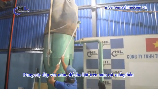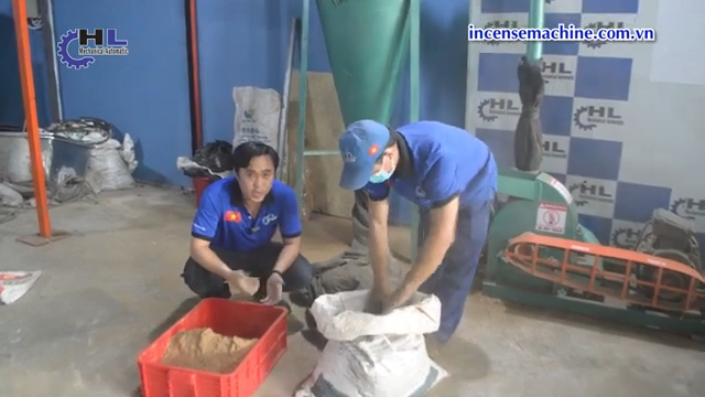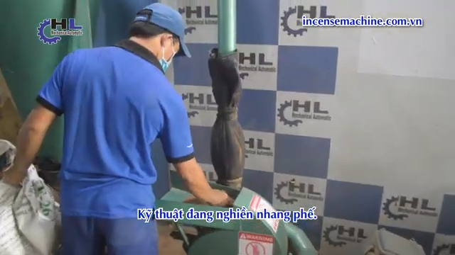 Sau khi máy hoạt động, nhang phế được đưa vào buồng nghiền. Hệ thống búa bên trong nghiền nhỏ nguyên liệu và đưa qua mặt sàng, tạo thành bột nhang mịn. Khi nghiền xong, có thể dùng que gõ nhẹ vào thân máy để bột còn bám rơi xuống, sau đó thu bột ra ngoài.