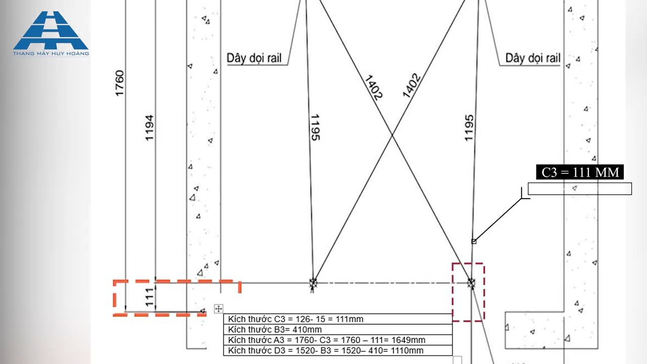 Tiếp theo là xác định vị trí chì cửa số 1 bên trái. Khoảng cách C3 được tính bằng 126 − 15 = 111 mm. Trong đó 126 mm là khoảng cách từ tường trước mặt cửa đến vị trí siêu cabin và 15 mm là khoảng cách từ siêu cabin đến tâm siêu cabin vì khoảng cách giữa siêu cabin và siêu cửa tầng là 30 mm. Do đó từ siêu cabin đến tâm sẽ là 15 mm. Khoảng cách từ mép khung bao cửa bên trái vào tường được tính theo chiều sâu hố thang. Khi chiều sâu hố thang là 1.760 mm thì D3 = 1.520 − 410 = 1.110 mm, trong đó 410 mm là kích thước từ dây chì đến tường bên trái hố thang.
