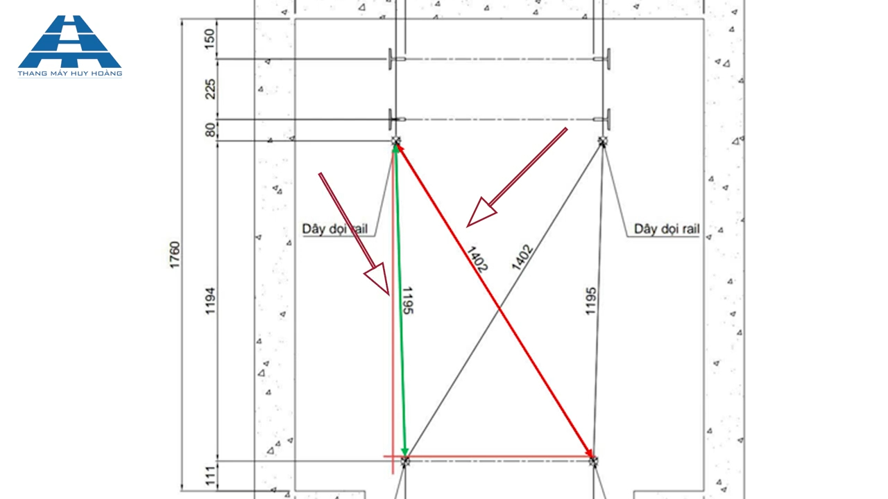 Sau khi xác định các kích thước cơ bản, kỹ thuật viên cần kiểm tra đường chéo để đảm bảo độ vuông góc của hệ thống dây chì. Đường chéo thứ nhất có kích thước 1.402 mm, được tính theo định lý Pythagore khi biết hai cạnh của tam giác vuông. Cạnh theo chiều sâu là 1.194 mm và cạnh theo chiều rộng là 735 mm, trong đó 700 mm là chiều rộng cửa và 35 mm là kích thước từ đỉnh dây đến kim. Đường chéo thứ hai có kích thước 1.195 mm, cũng được tính theo nguyên tắc tương tự khi biết hai cạnh còn lại của tam giác vuông.