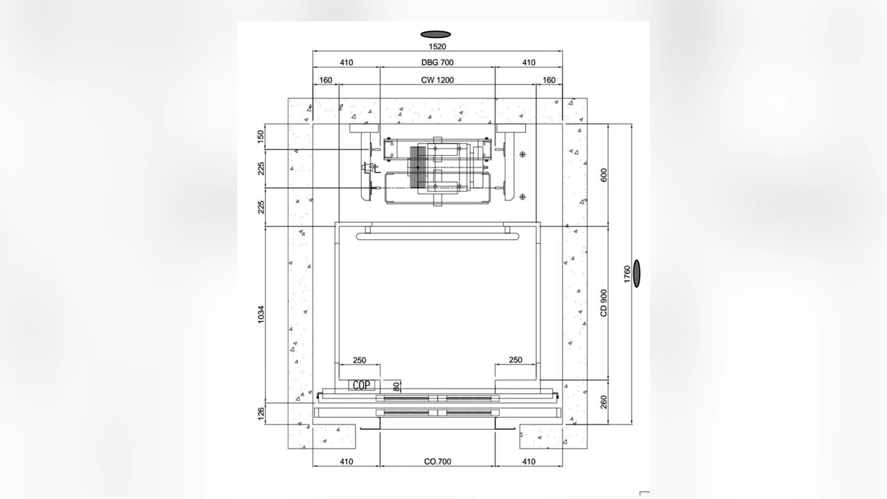 Theo bản vẽ lắp đặt, hố thang có kích thước chiều rộng 1.520 mm và chiều sâu 1.760 mm. Sau khi thả chì kiểm tra, các vị trí nhỏ nhất đo được trong hố thang lần lượt là A = 1.100 mm, B = 735 mm, C = 650 mm và D = 790 mm. Khi so sánh với kích thước theo bản vẽ lắp đặt, ta thấy tổng C + A bằng 1.760 mm và tổng B + D bằng 1.525 mm, lớn hơn kích thước bản vẽ 5 mm. Như vậy hố thang vẫn đạt yêu cầu để lắp đặt theo thiết kế.