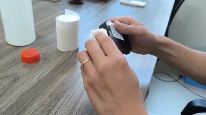 Khi thấy đầu mực bị tắc, anh chị có thể dùng khăn mềm hoặc giấy lau nhẹ nhàng lên đầu phun mực. Khi lau, anh chị cần miết theo một chiều chứ không nên lau qua lại nhiều lần vì điều này có thể làm bẩn đầu phun và khiến mực không ra đều. Sau khi lau sạch, anh chị có thể lắp hộp mực trở lại máy và thử in để kiểm tra xem đầu mực đã hoạt động bình thường hay chưa.