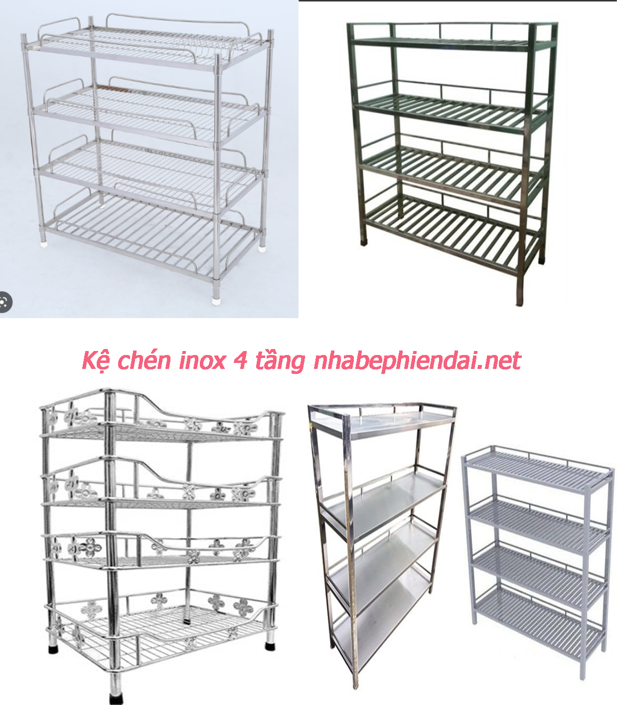 - Kệ inox 4 tầng có thanh nan: Loại kệ này có các thanh nan inox ở giữa các tầng, giúp bạn dễ dàng cất giữ các vật dụng nhỏ. Kệ thường được sử dụng để lưu trữ bát đĩa, đồ dùng nhà bếp,…